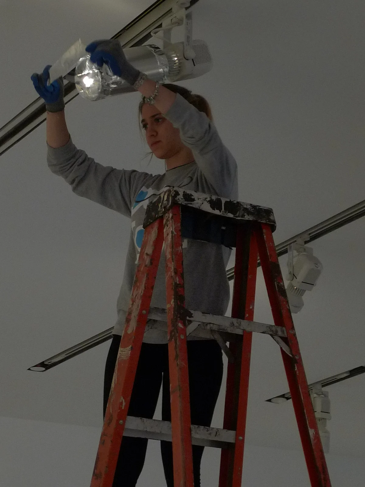 This week i worked with a group of lighting students to focus lights in the Sheila Johnson Design Center - the main public exhibition space at Parsons. The process starts with a gallery tour with the curator in order to understand the exhibition context. Students subsequently develop a lighting scheme and make all physical modifications to the track lighting system. This process takes 8-10 hours of late night, hot and dirty work. It involves carefully navigating around the exhibition works, removing and relocating luminaires, changing light sources, modifying optics, screening output, building accessory hoods and modifying control programming. It has proven to be an invaluable hands on experience - offering students a truly tangible understanding of lighting design.